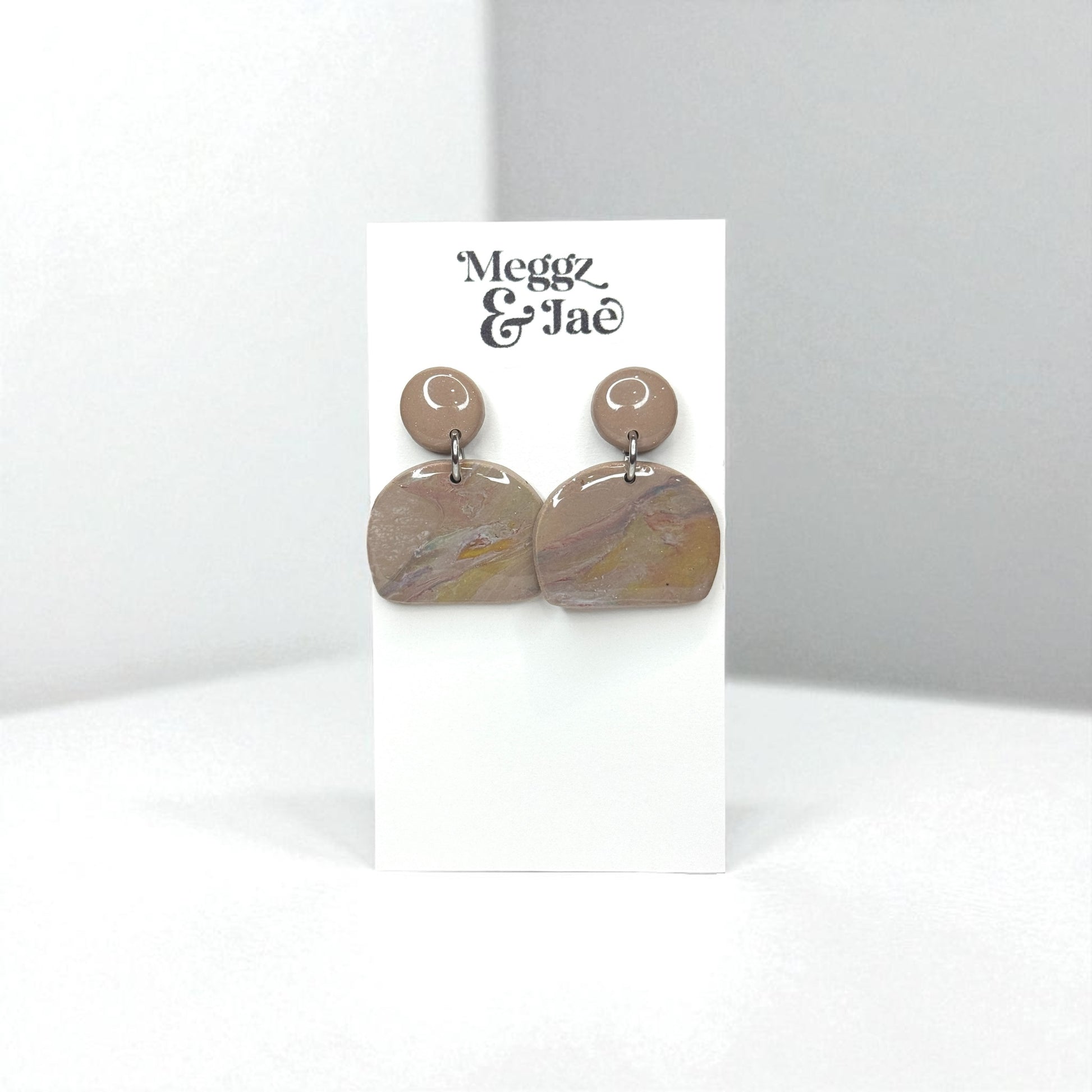 These handcrafted polymer clay earrings feature a soft taupe stud paired with a rounded half-arch drop in a subtle marbled blend of earthy neutrals. The glossy finish enhances the natural stone-like effect, giving each pair a unique and organic feel.