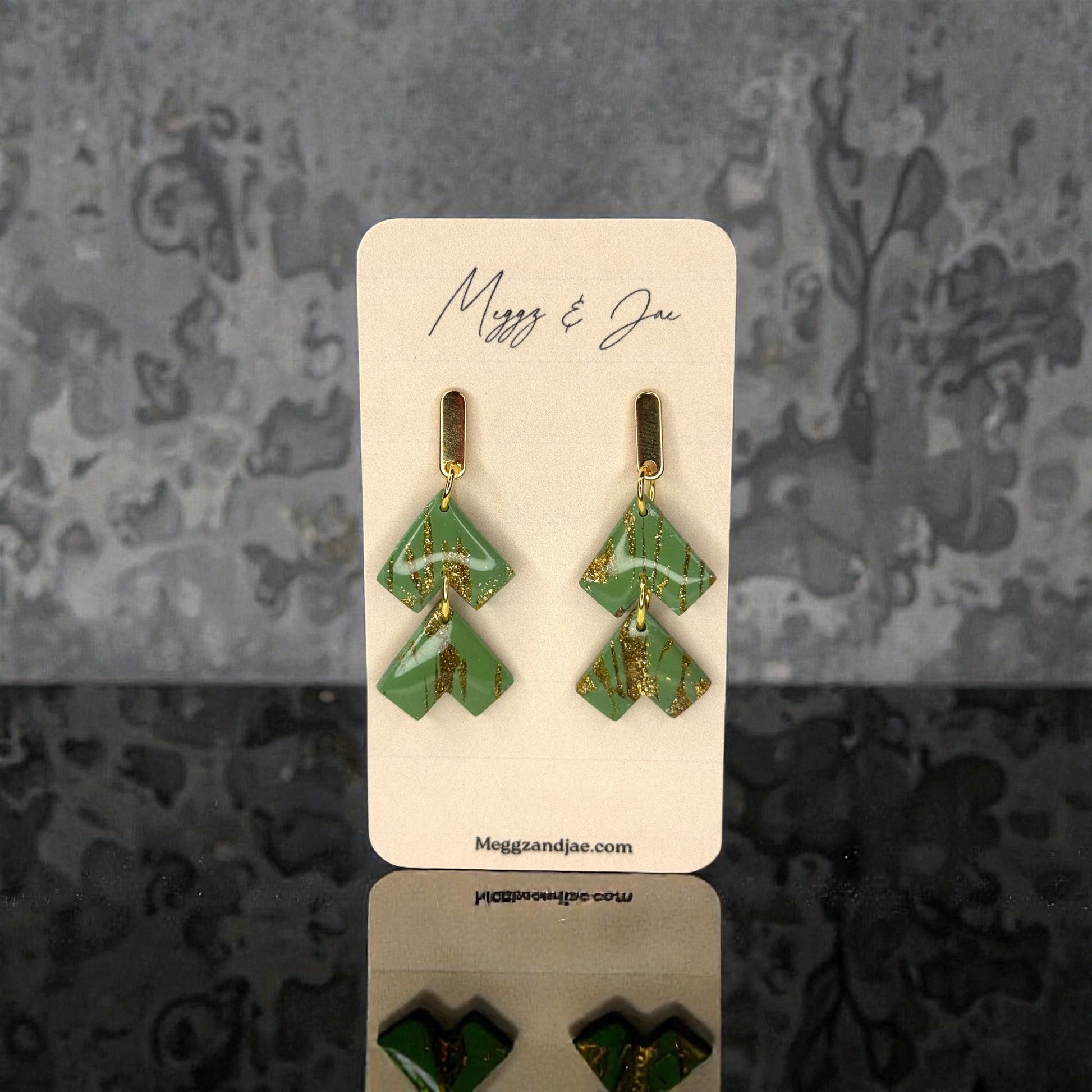 These handmade polymer clay earrings feature layered geometric shapes in a rich sage green accented with shimmering gold detailing. Finished with sleek gold bar studs, this design offers elegant movement while remaining lightweight and comfortable for everyday wear.