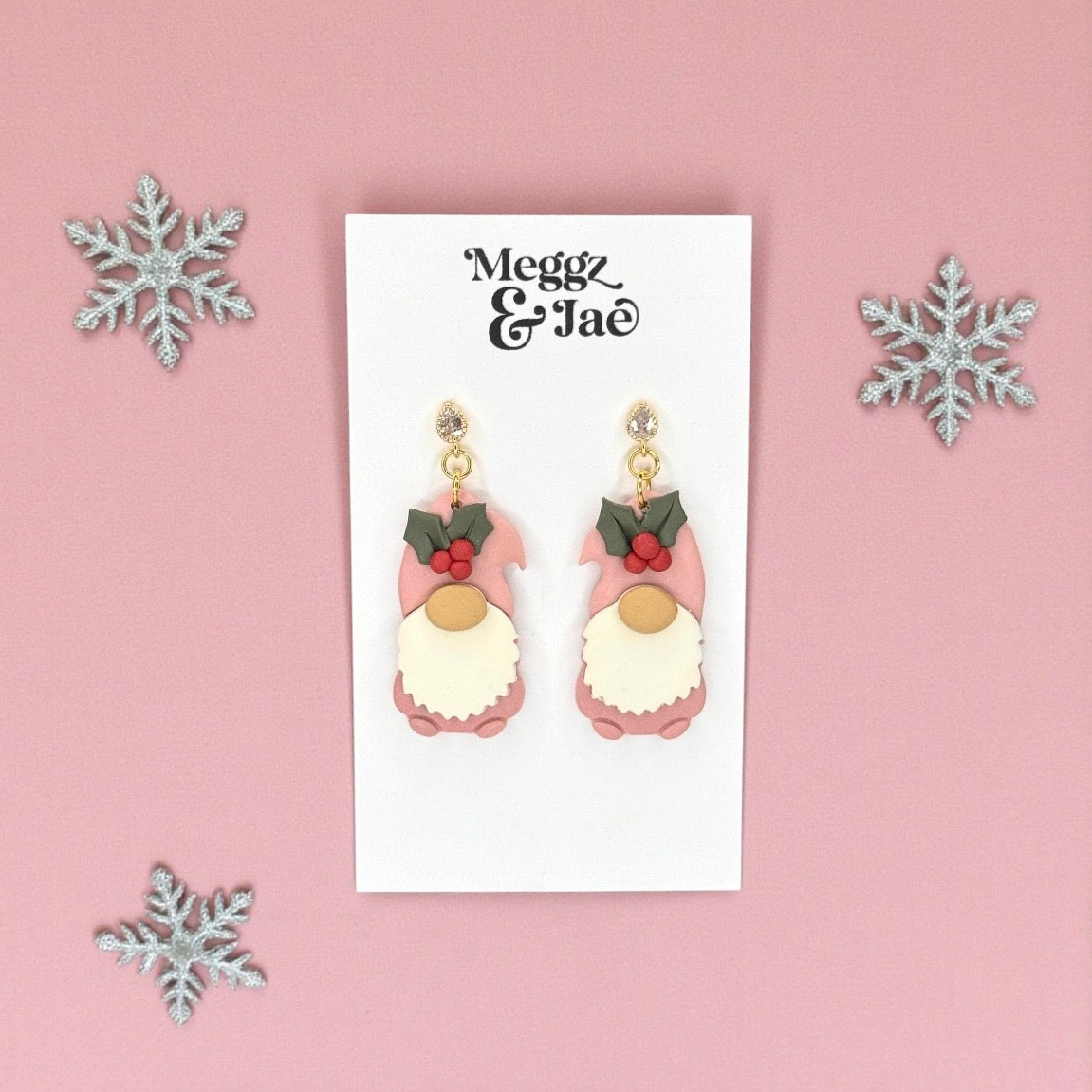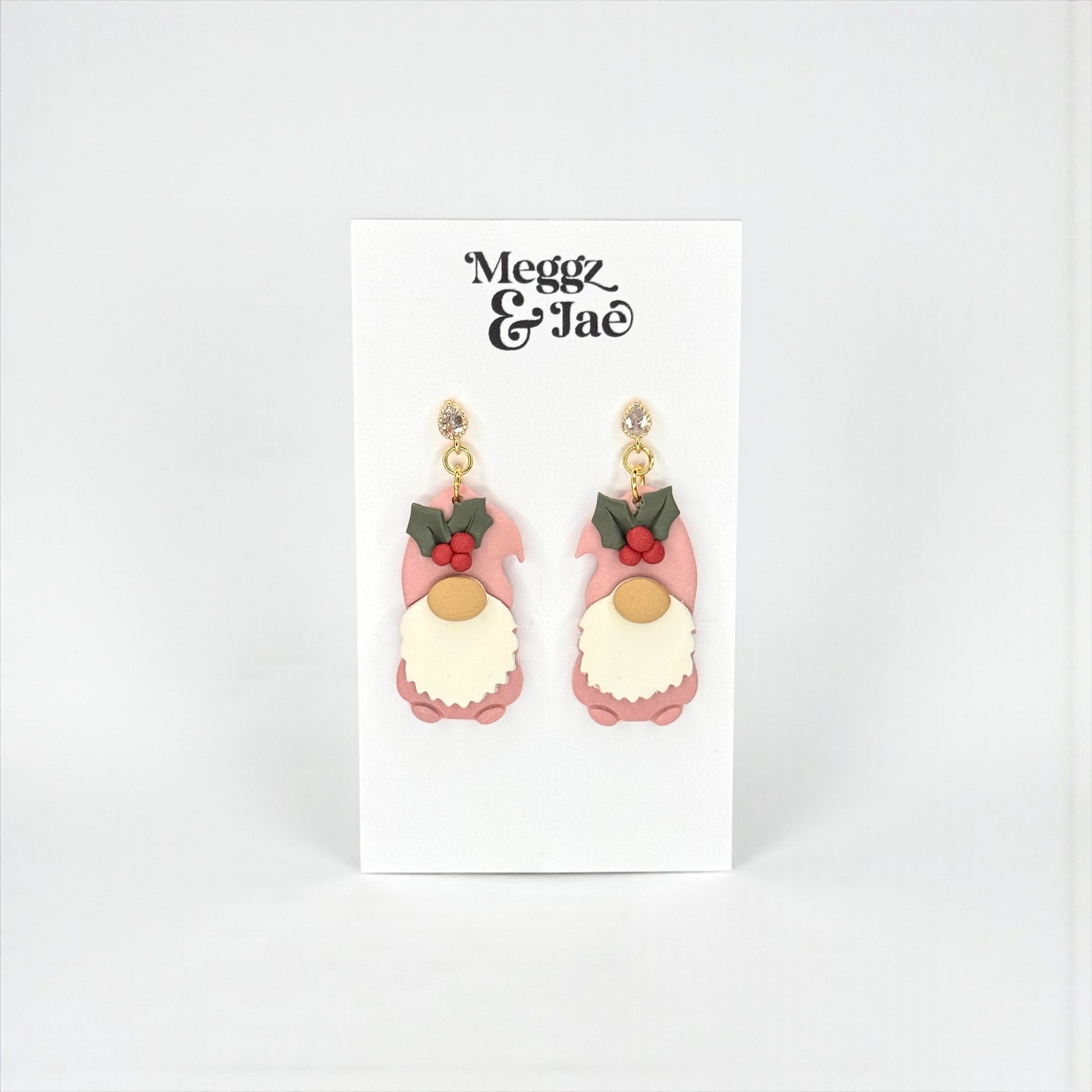 Add a touch of holiday magic with these charming pink Christmas gnome earrings! Each pair is lovingly handmade from polymer clay and features a cozy gnome with a soft pink hat, holly leaves, and bright red berries, finished with a subtle sparkle from a crystal stud top.