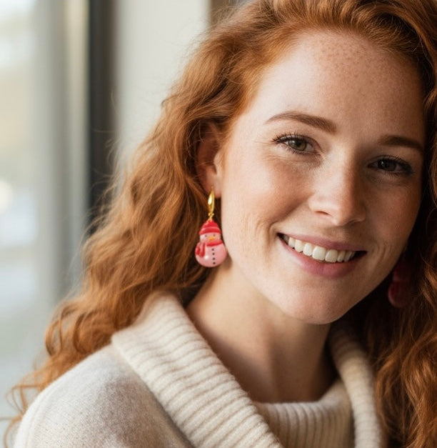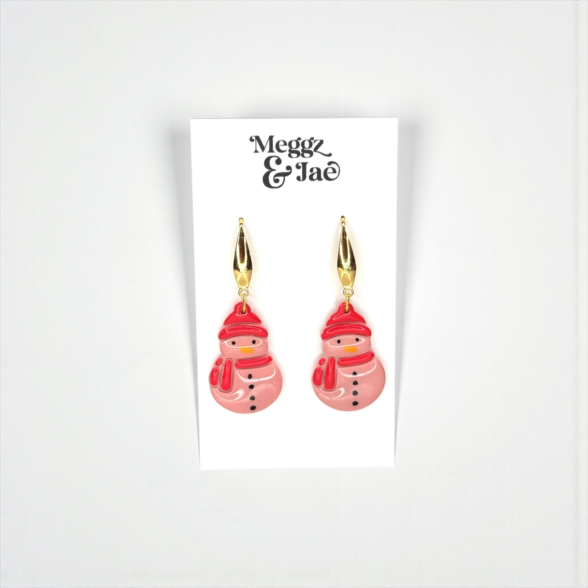 Bring a cozy touch of winter cheer to your look with these handmade pink snowman earrings! Each pair is crafted from polymer clay and features adorable details — a rosy hat, matching scarf, and tiny buttons — all finished with gold hooks for a festive shimmer. Lightweight, hypoallergenic, and full of holiday spirit.