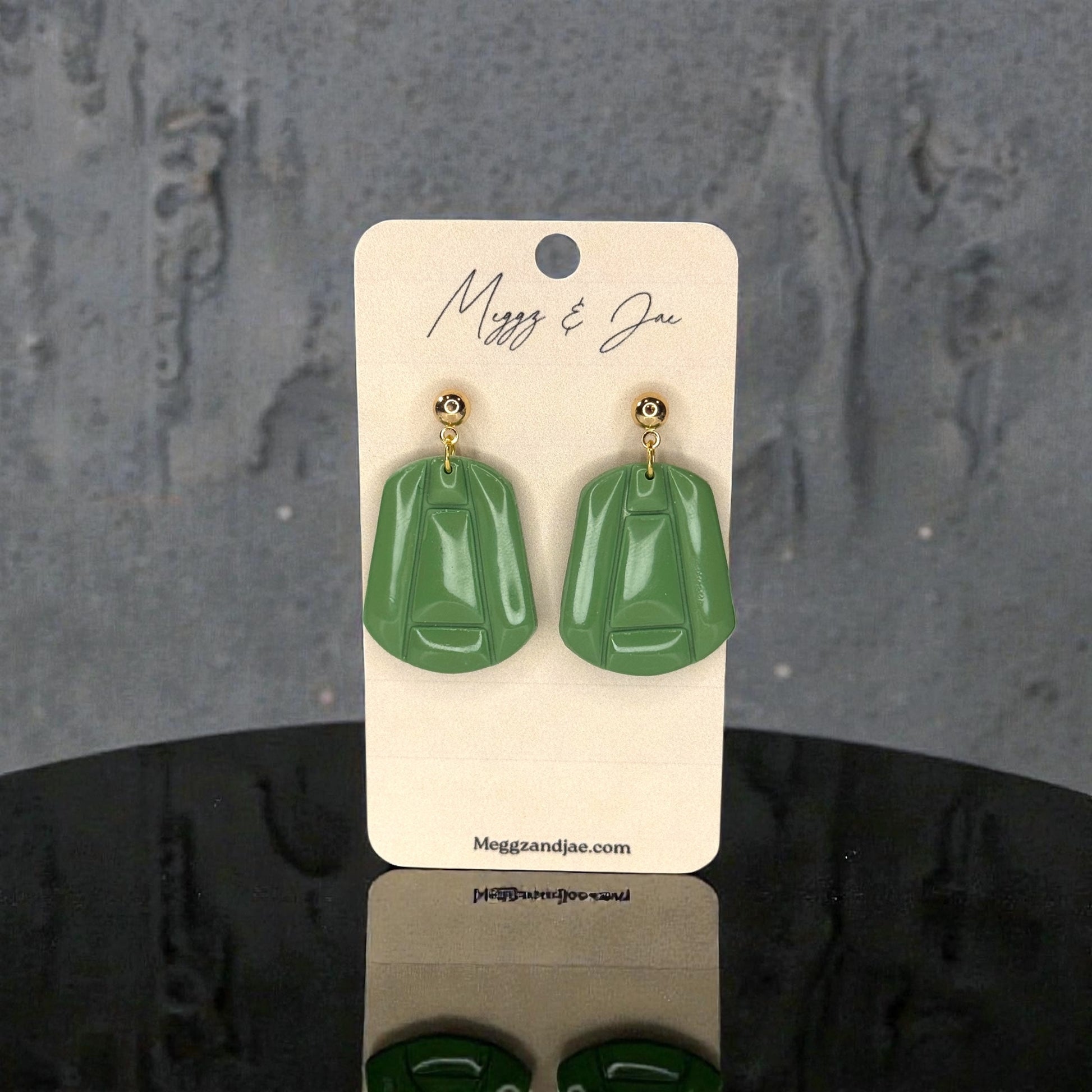 These earrings feature a modern, sculptural silhouette with a softly structured shape and subtle carved detailing that adds depth and dimension without overwhelming the design. The smooth, high-gloss finish highlights the rich green tone, giving the earrings a polished, elevated look that feels both contemporary and timeless.