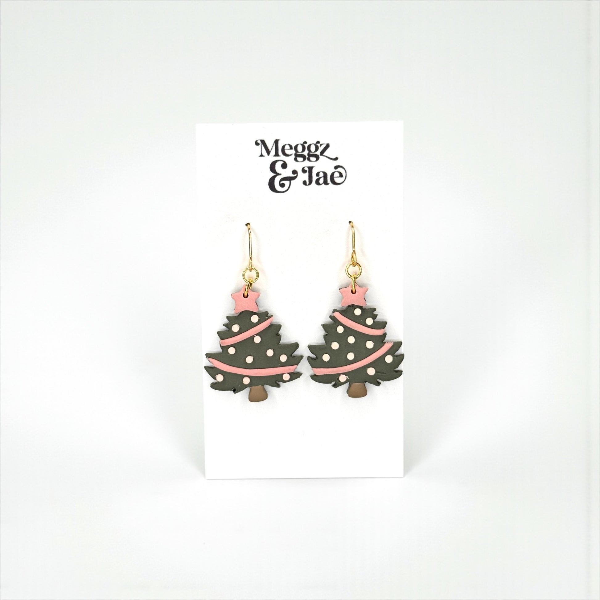 Add a sweet touch of holiday cheer with these handmade polymer clay Christmas tree earrings. Featuring deep green trees adorned with pink garland, white polka dots, and a matching star topper, they’re the perfect mix of festive and feminine. Lightweight, hypoallergenic, and finished with gold hooks for a polished holiday sparkle.