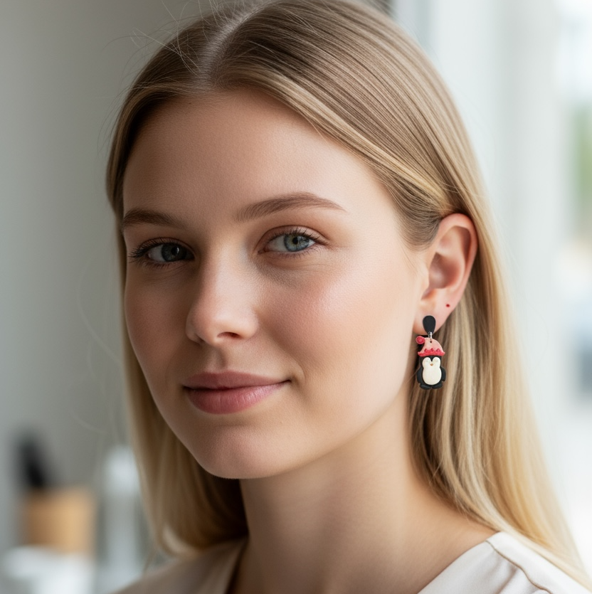 Bring the winter cheer wherever you go with these adorable handmade penguin earrings! Each pair features a cute black and white penguin wearing a festive pink and red Santa hat, the perfect touch of holiday fun. Lightweight, hypoallergenic, and completely handcrafted with polymer clay, these earrings are as comfortable as they are charming.