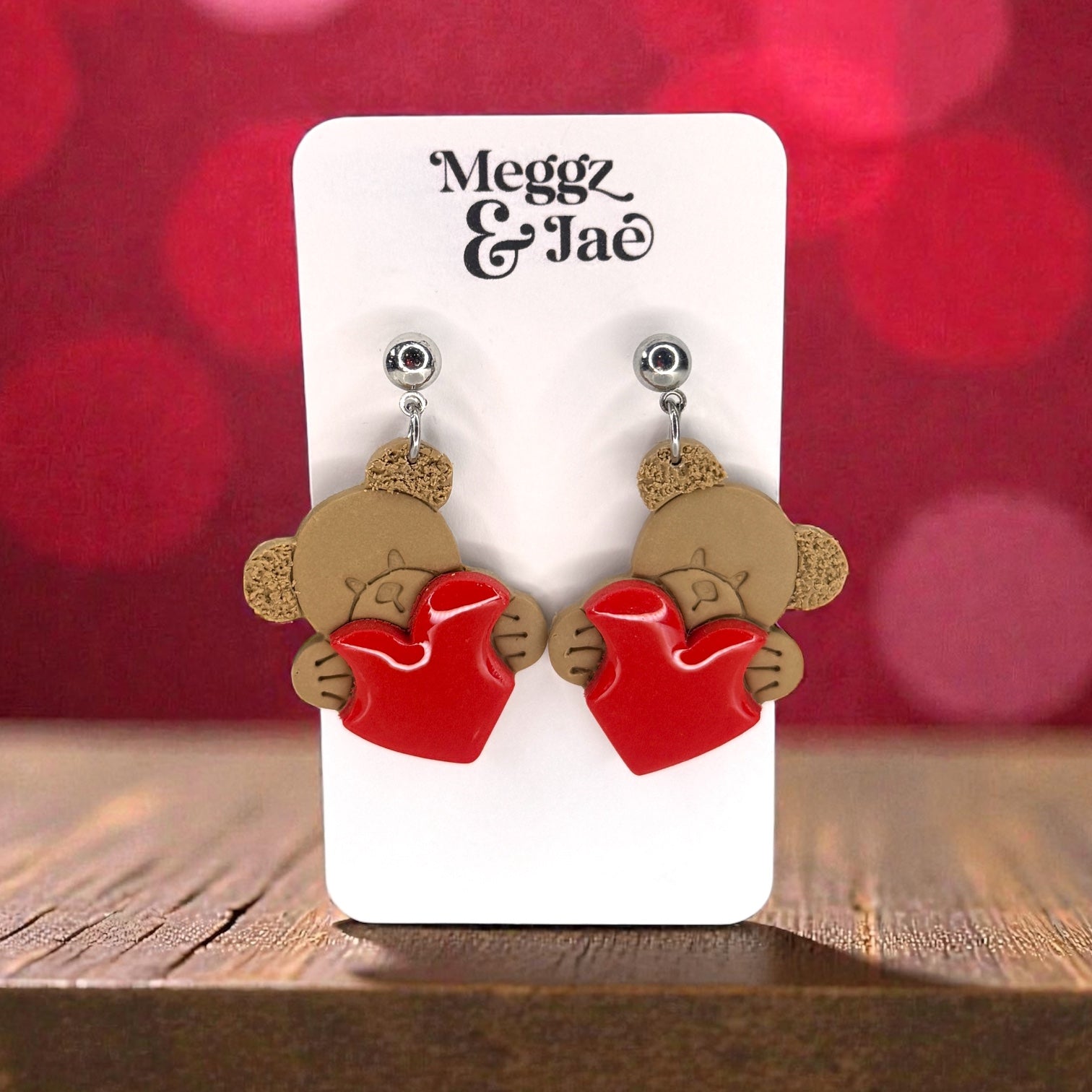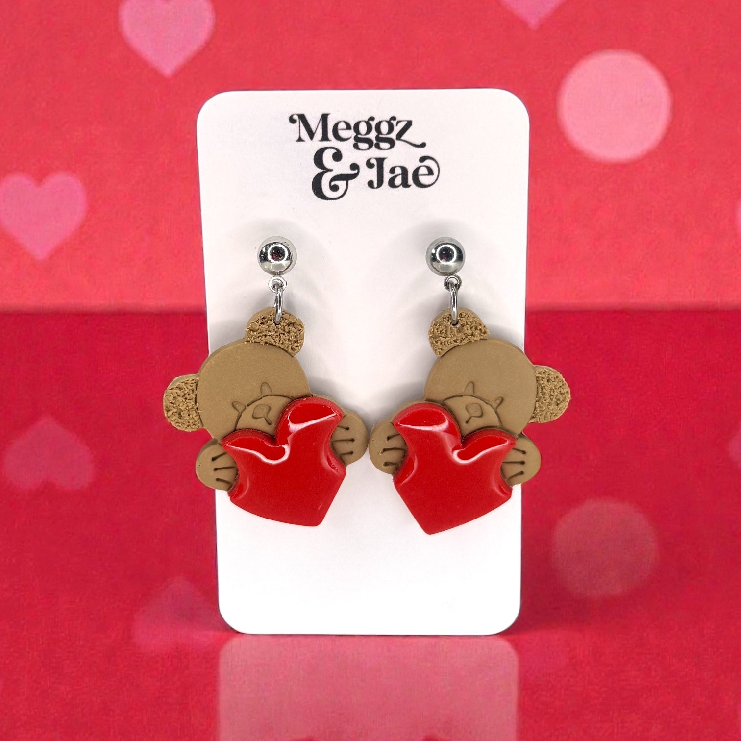 Teddy bear holding a heart valentines polymer clay earrings
