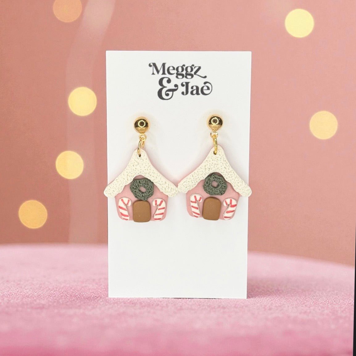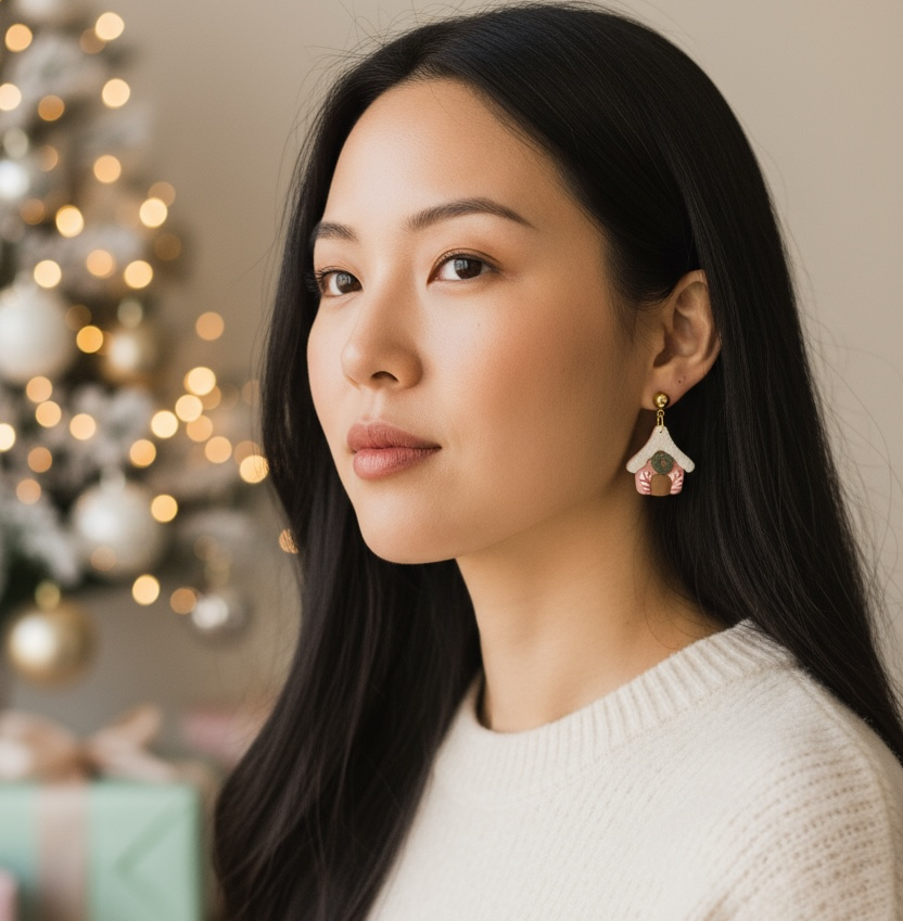Bring the magic of Christmas to life with these adorable handmade polymer clay gingerbread house earrings. Featuring candy cane details, tiny wreath accents, and a snowy textured roof, they’re the perfect mix of cozy and festive. Lightweight, hypoallergenic, and finished with gold studs for a sweet holiday sparkle.