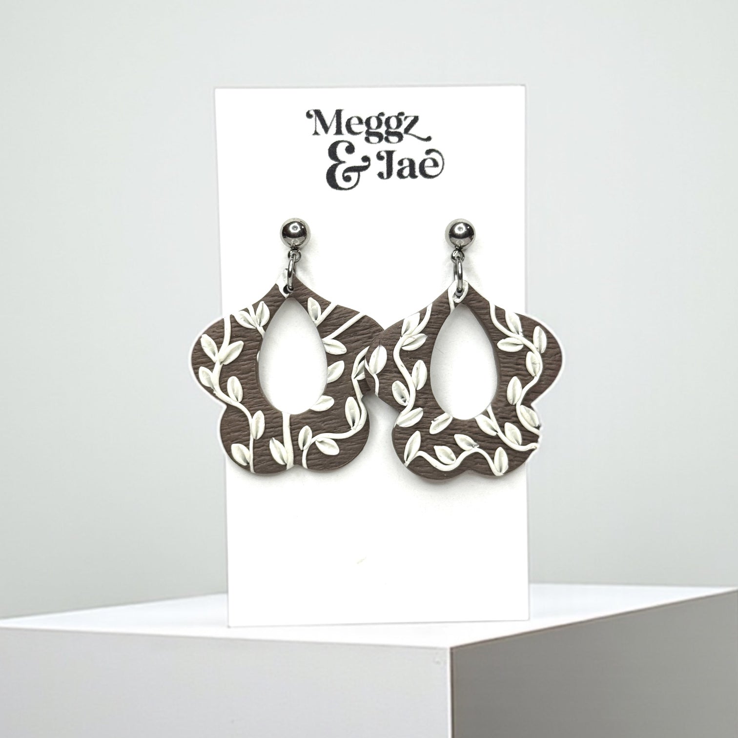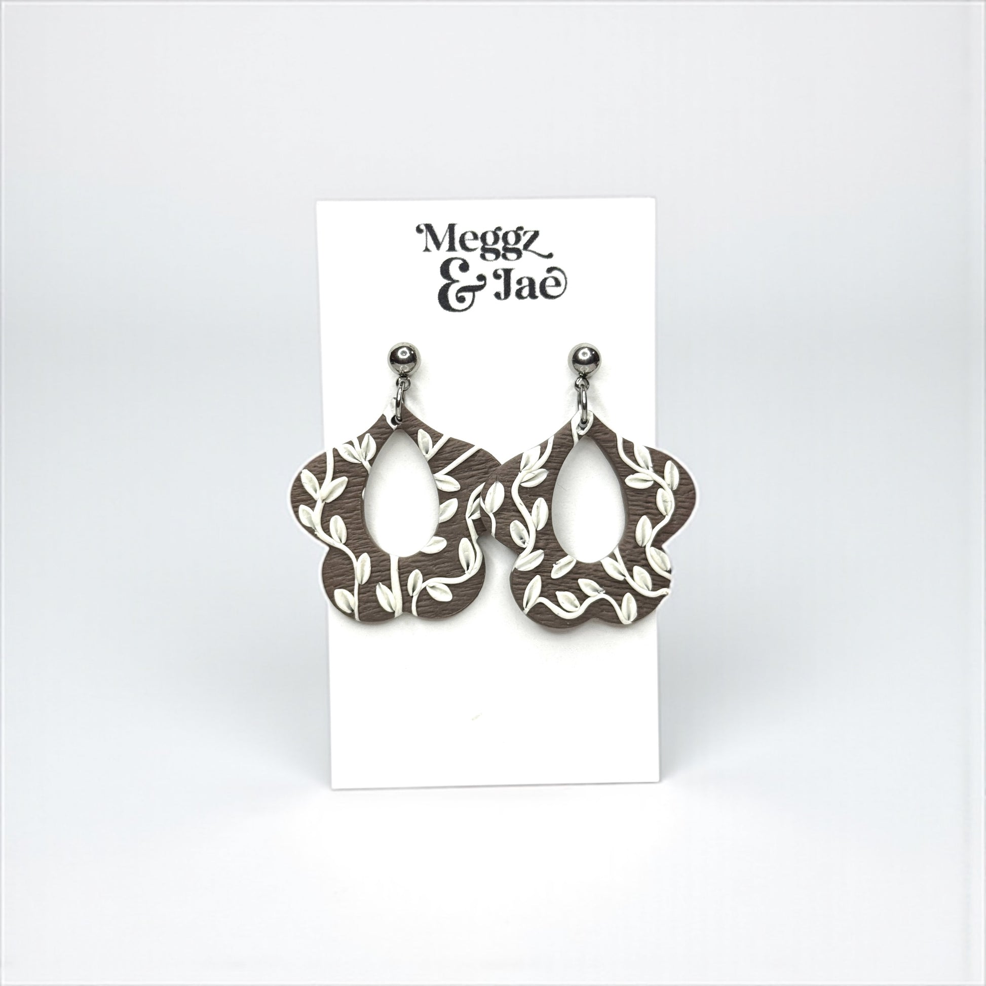 These handcrafted polymer clay earrings feature a bold, wavy floral-inspired shape with a modern teardrop cutout. The deep grey base is delicately hand-detailed with ivory vine accents, creating a natural yet elegant look. Finished with stainless steel studs, they’re lightweight, hypoallergenic, and perfect for everyday wear or adding a touch of artistry to your outfit.