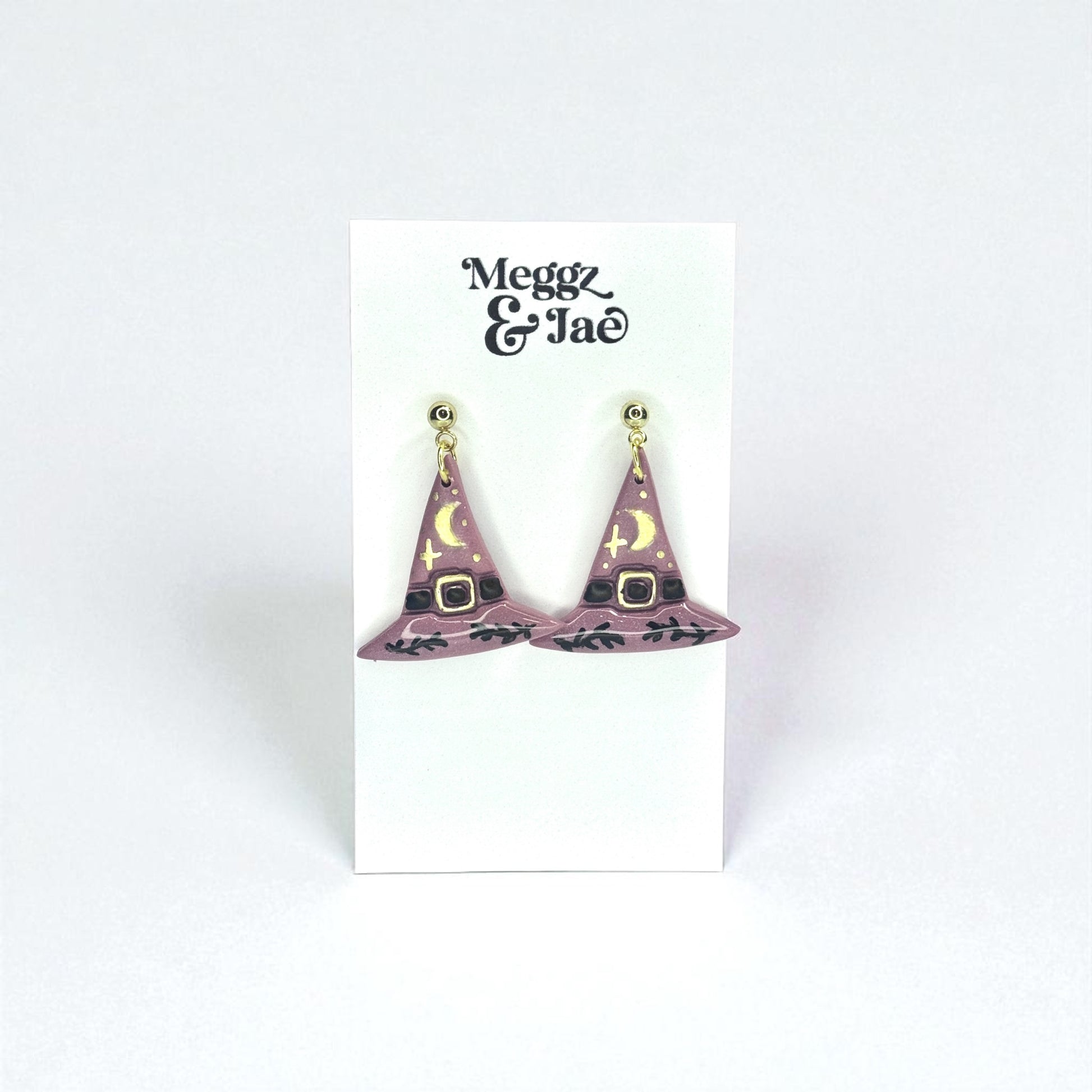 Add a touch of magic to your look with these handcrafted witch hat earrings. Made from lightweight polymer clay, each hat features celestial details with golden moons and stars, a charming buckle, and leafy accents along the brim. Perfect for Halloween or year-round mystical vibes, these statement earrings are hypoallergenic, one-of-a-kind, and designed to turn heads.