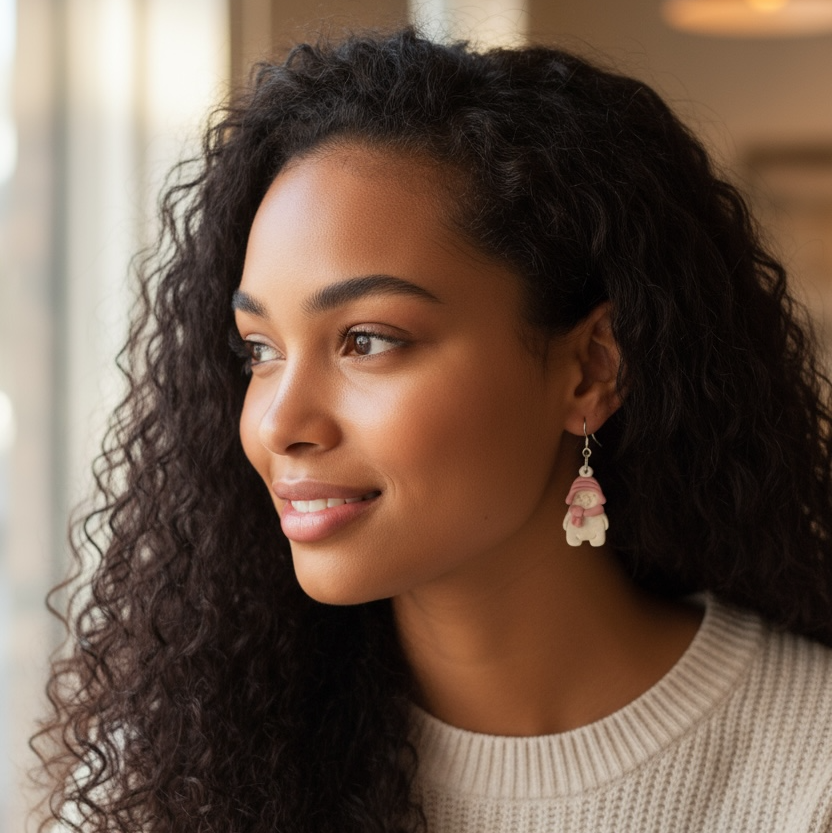 Bring cozy winter charm to your outfit with these handmade polar bear earrings — featuring soft blush tones, a snuggly hat, and a matching scarf. Each pair is handcrafted with polymer clay and sprinkled with a subtle shimmer that captures the magic of freshly fallen snow.