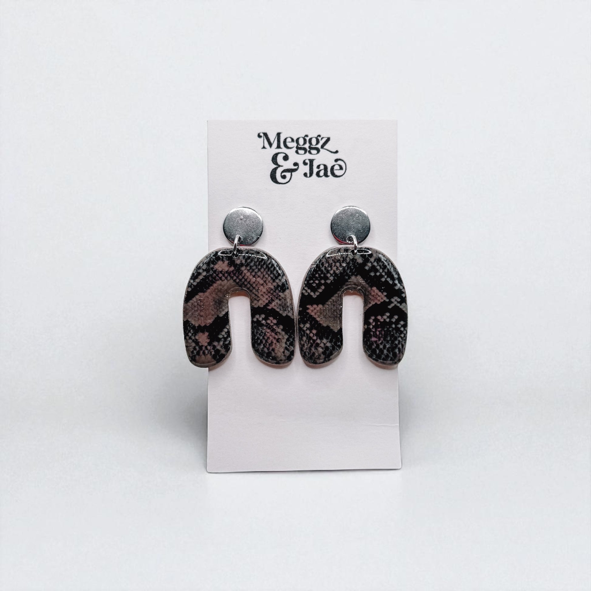 Edgy and modern, these handmade polymer clay earrings feature a sleek U shape arch design with a bold snakeskin pattern and stainless steel circle toppers. Lightweight and hypoallergenic, they’re the perfect statement piece for adding a touch of wild sophistication