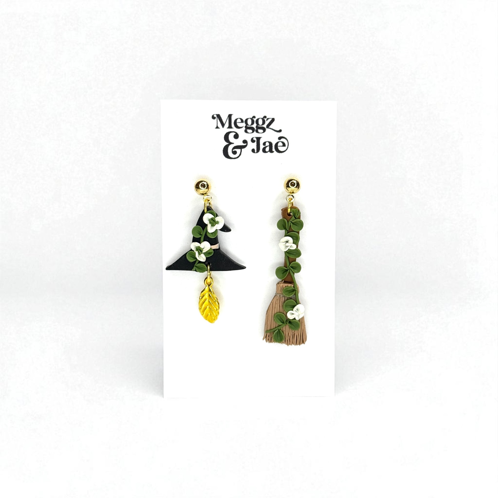 Enchanted and elegant, this handmade polymer clay earring set features a mismatched design—one a witch’s hat adorned with flowers and a golden leaf charm, the other a broom twined with greenery and delicate blossoms. A perfect mix of mystical and feminine, they’re made to bring a little woodland magic to your spooky season style.